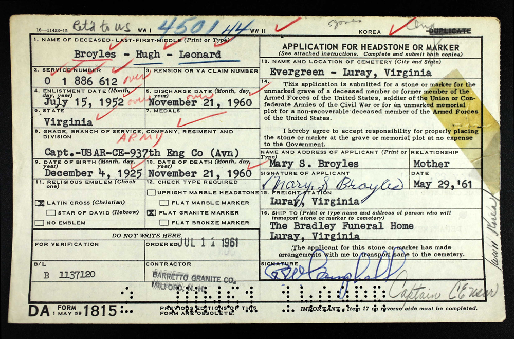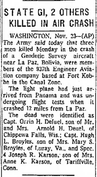 Captain Broyles was killed in a plane crash in Bolivia while serving as Chief of Geodetic Survey