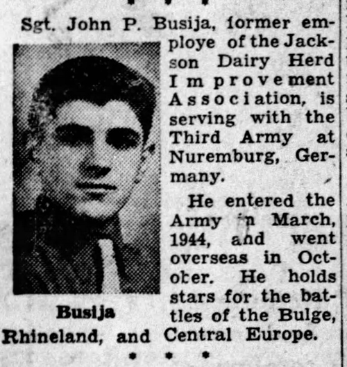 Sergeant John Busija, Corps of Engineers, Company C, 284th Engineer Combat Battalion, United States Army, is awarded the Bronze Star Medal for heroic achievement in connection with military operations against an enemy of the United States at Belingries, Germany on 26 April 1945. While awaiting elimination of enemy observation in order to construct a bridge across the Altmuhl River. Sergeant Busija, a squad leader, volunteered to assist in the evacuating of infantry casualties across the swift river. He courageously participated under heavy enemy observed mortar fire and also assisted those hit during this hazardous operation. Sergeant Busija’s heroic actions reflect great credit on him and the armed forces of the United States.