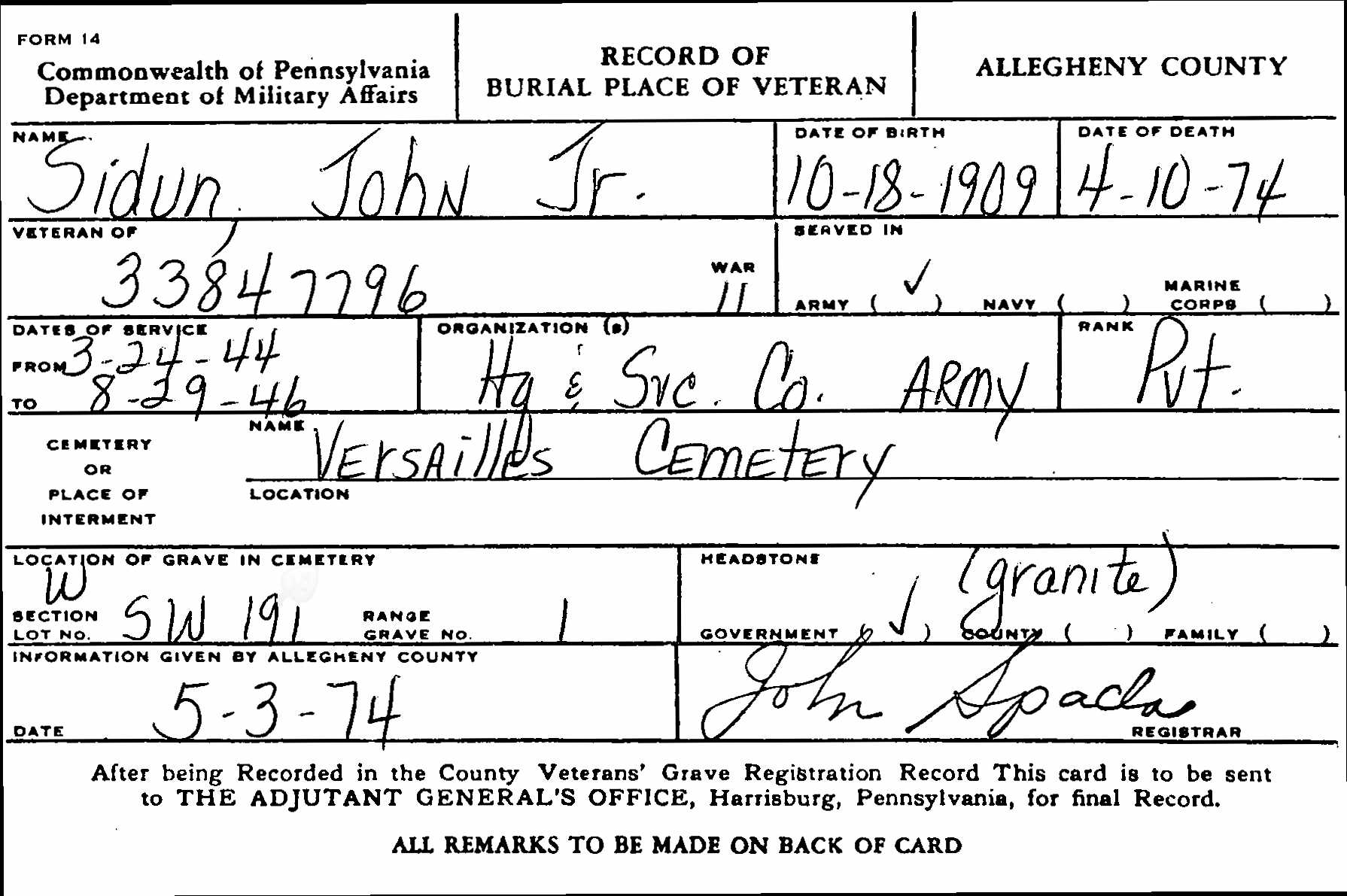 PVT John Sidun Jr