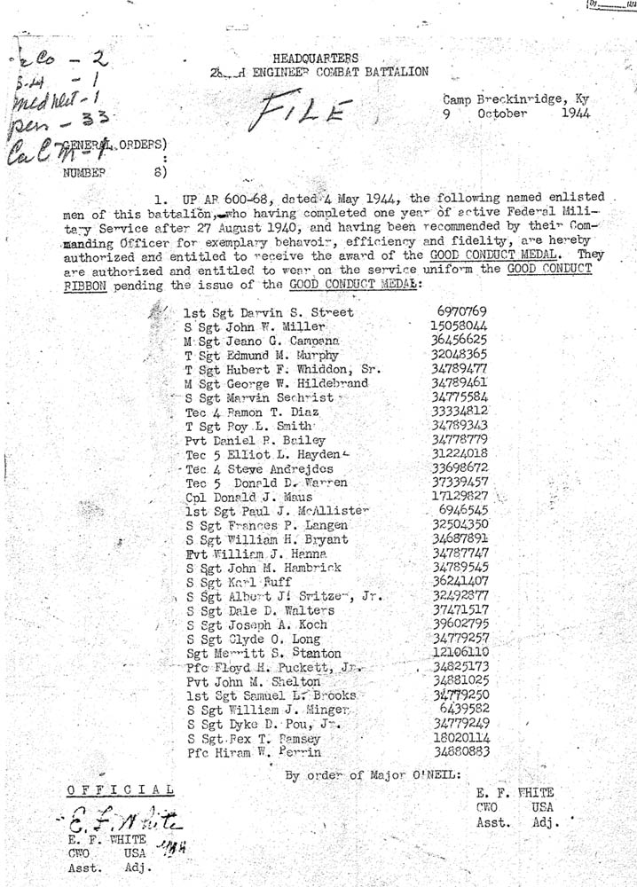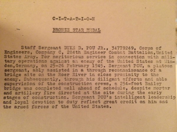 The Bronze Star Medal is awarded for ably assisting in a thorough reconnaissance of a bridge site on the Roer River in close proximity to the enemy. Subsequently, through his diligent efforts and able supervision of the construction crews a 254' fixed Bailey Bridge was completed well ahead of schedule, despite mortar and artillery fire directed at the site during the initial stages of construction.